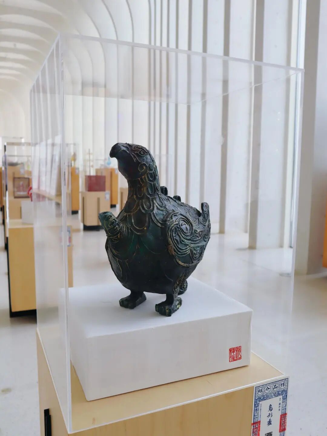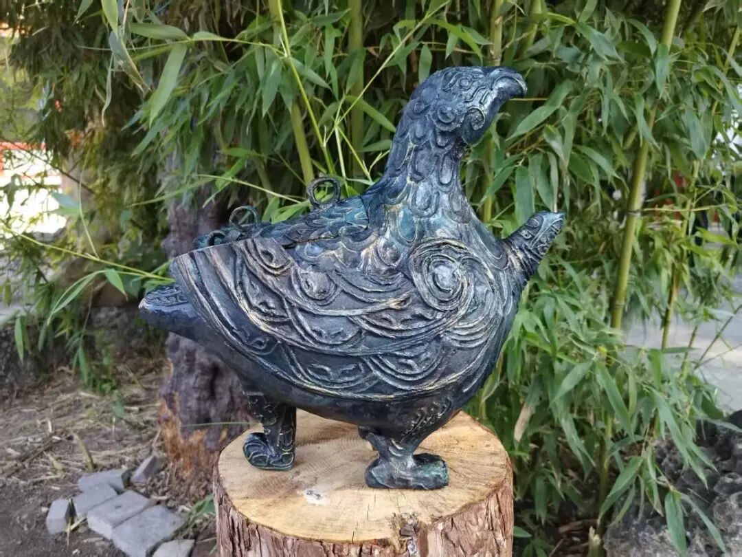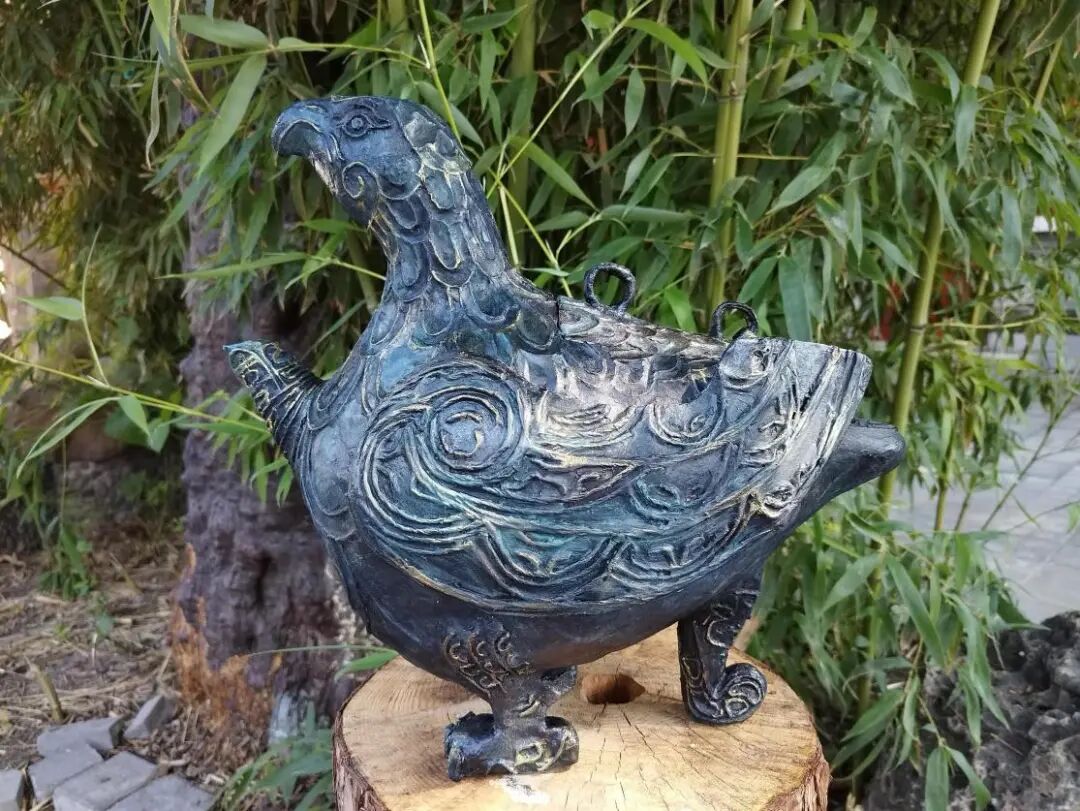设计理念:鸟首前伸,圆目凸出,尖喙下弯。胸腹部斜伸出一束腰状长流,流口平齐。背开椭方形口,设有带链环的环钮盖,与鸟身后背相连。前有双鸟足,后有一外卷象鼻状独足,形成三足鼎立。通体饰有繁复的鳞纹、卷云纹等,以云雷纹为底。表面红铜色与铜绿色锈蚀相间,瑰丽非凡。