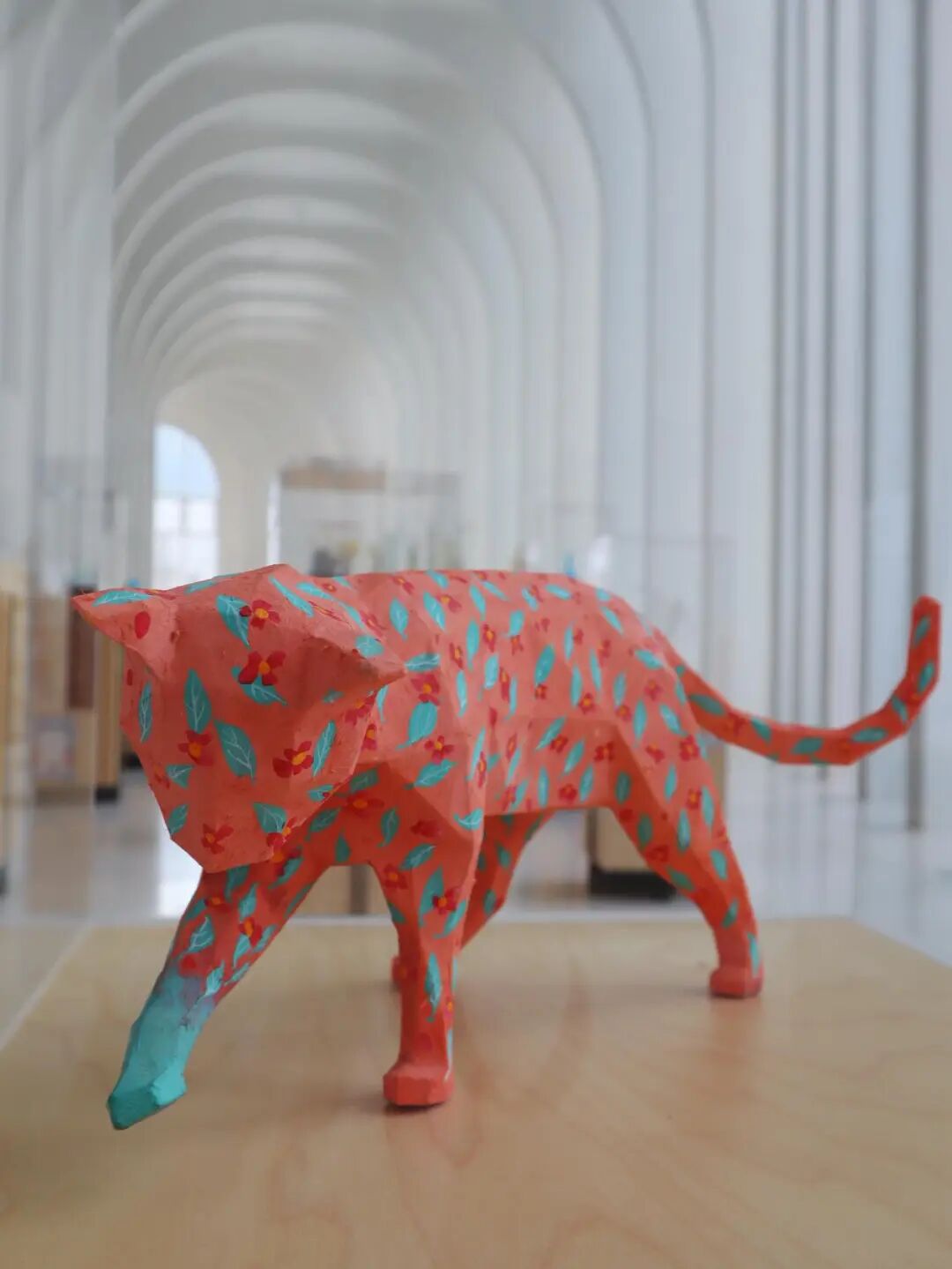 设计理念:用现代年轻人喜欢的宠物猫猫为创作原型,捕捉小花猫在逗趣玩耍之动态生成,采用传动纸浆塑性加人工手绘,以静制动,凝固美好,唤醒人与动物之间的美好情愫,共同创造美好生活。
